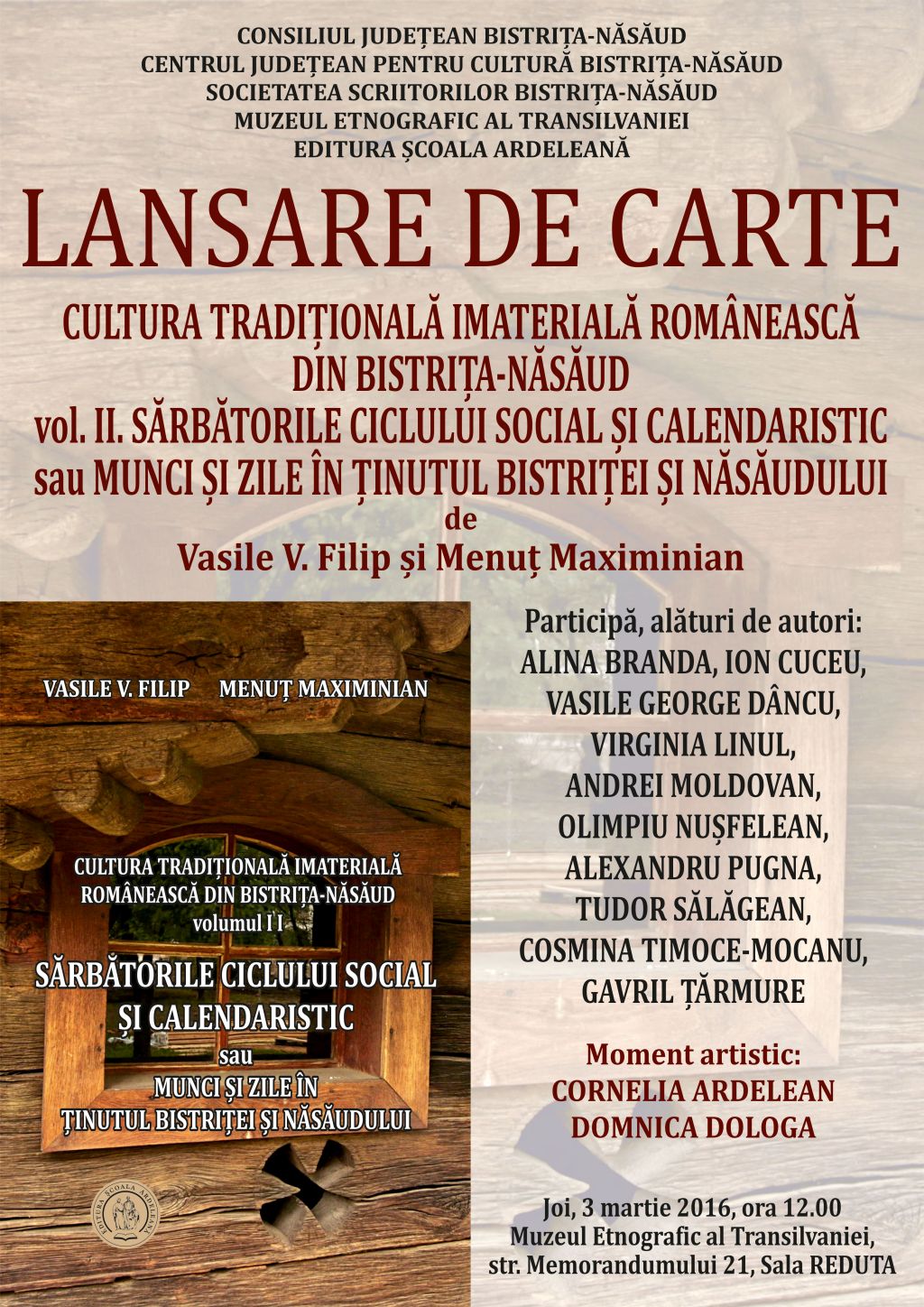 Volumul „Cultura tradițională imaterială românească din Bistrița-Năsăud Vol. II – Sărbătorile ciclului social și calendaristic sau Munci și zile în Ținutul Bistriței și Năsăudului”, scris de Vasile Filip și Menuț Maximinian, a fost publicat la editura clujeană Școala Ardeleană și se lansează joi la ora 12, în sala Reduta a Muzeului Etnografic al Transilvaniei.